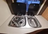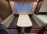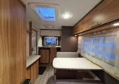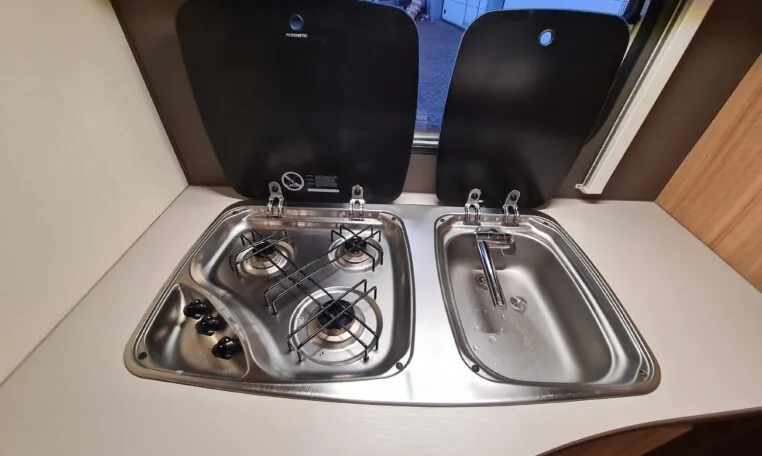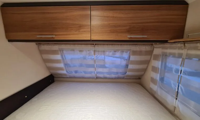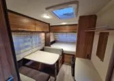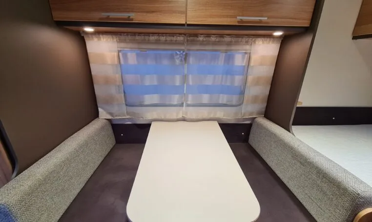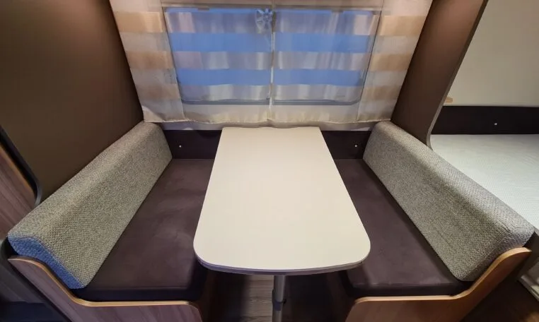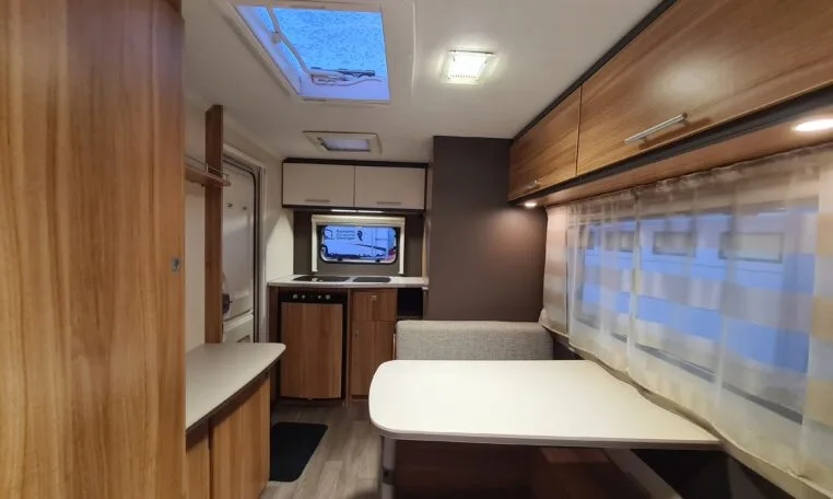 De caravan is geschikt voor 4 personen en is ingedeeld met aan de achterzijde een keuken met voldoende aflegruimte, in het midden een dinette met ruimte voor 4 en voorin een vast bed met daaronder veel opbergruimte.