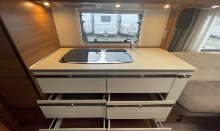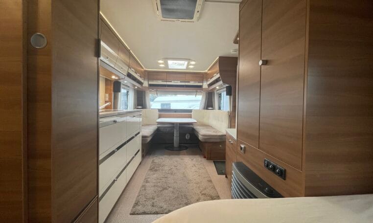 Een ruime en rijk uitgevoerde caravan die van alle gemakken is voorzien.