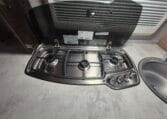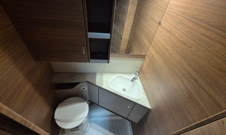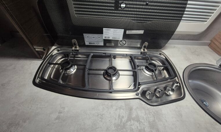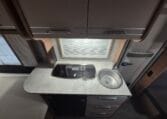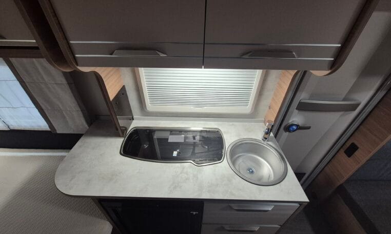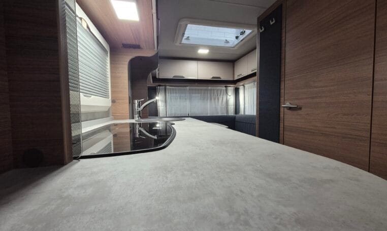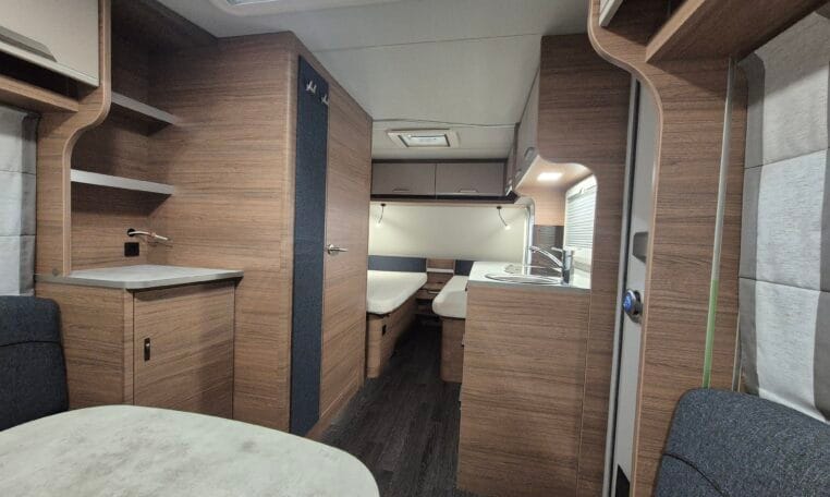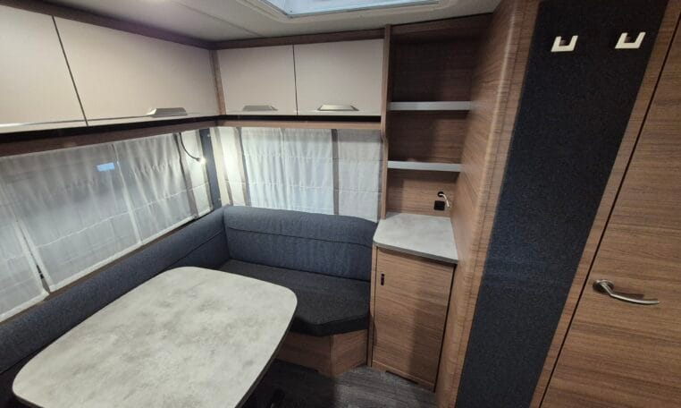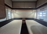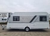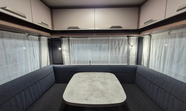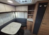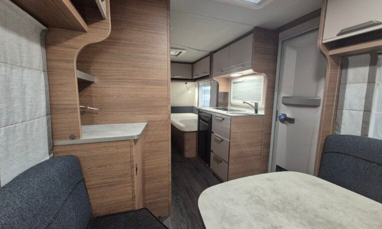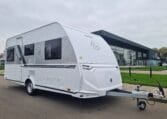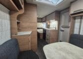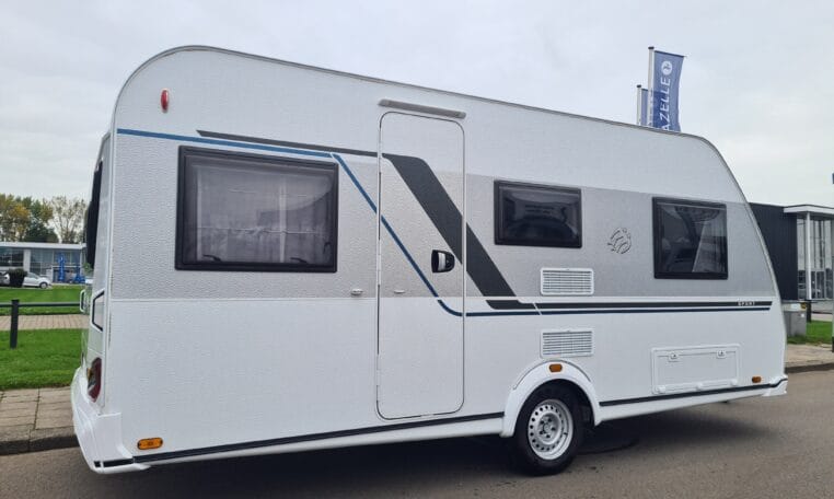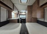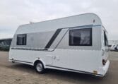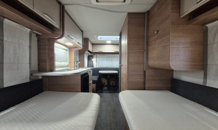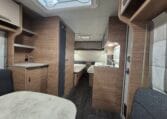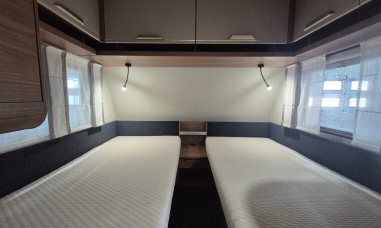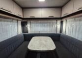 Deze caravan heeft een fijne indeling met een standaardzit achterin, in het midden bevind zich een keuken en toiletruimte en voorin 2 enkele bedden met rolbedfunctie om er 1 groot bed van te maken.