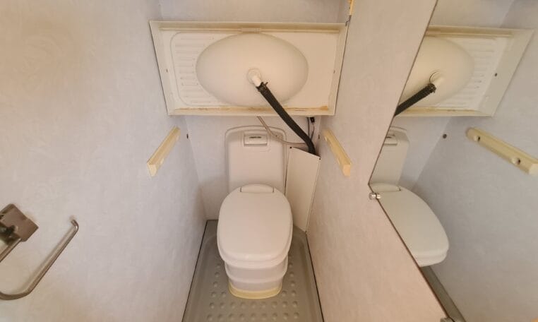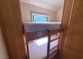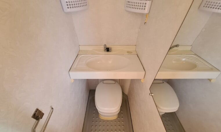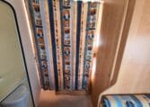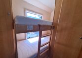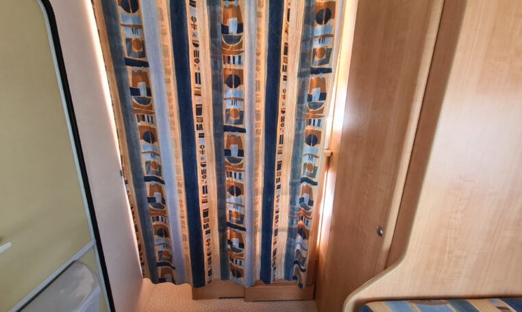 Aan de buitenzijde bevind zich een “garagedeur” waardoor er fietsen in de caravan geplaatst kunnen worden door het onderste stapelbed op te klappen.