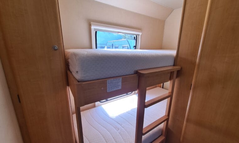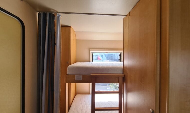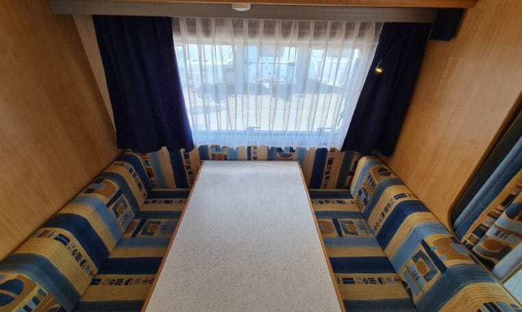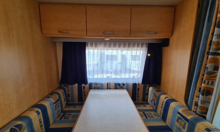 Topindeling met aan de achterzijde 2 stapelbedden, in het midden de dinette om gezellig samen te eten en voorin een lekker comfortabel vast bed.