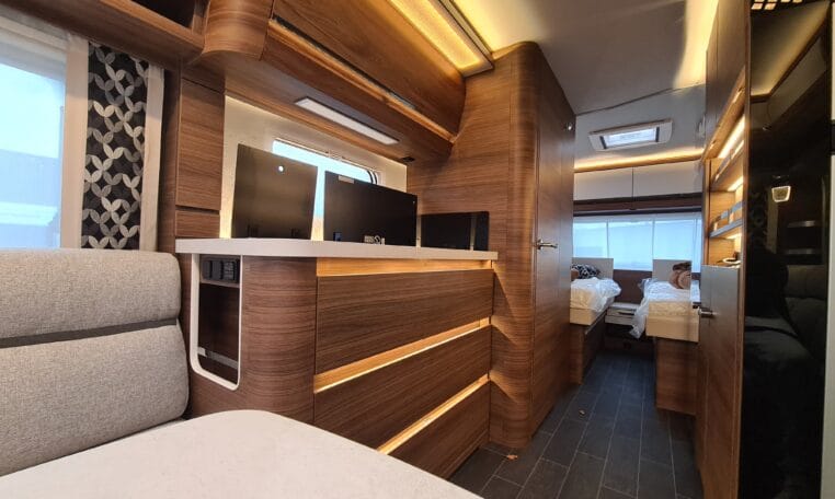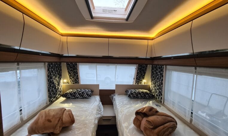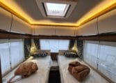 Het interieur ademt luxe met hoogwaardige materialen, een modern design en doordachte indeling. De enkele bedden en ruime leefruimte zorgen voor optimaal comfort, terwijl de geavanceerde klimaatcontrole een perfect binnenklimaat garandeert.
