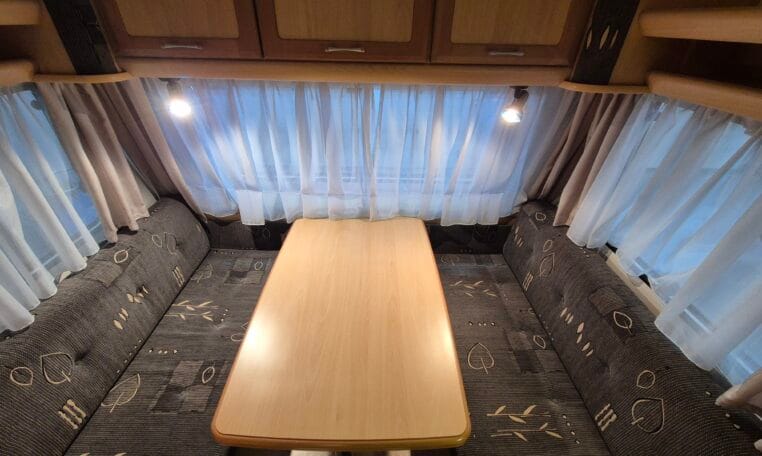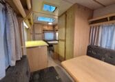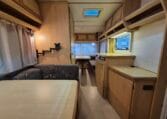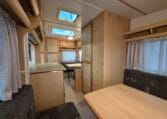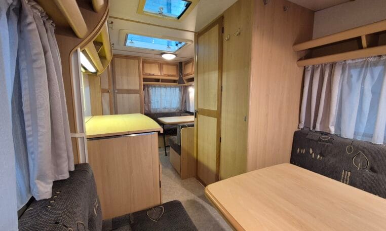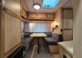 Met twee zitjes waarvan elk een bed te maken is zodat u er met vier personen goed in kan slapen. Van binnen heeft de caravan een warme kleurstelling in de kleuren antraciet-bruin in combinatie met de warme houtkleur.